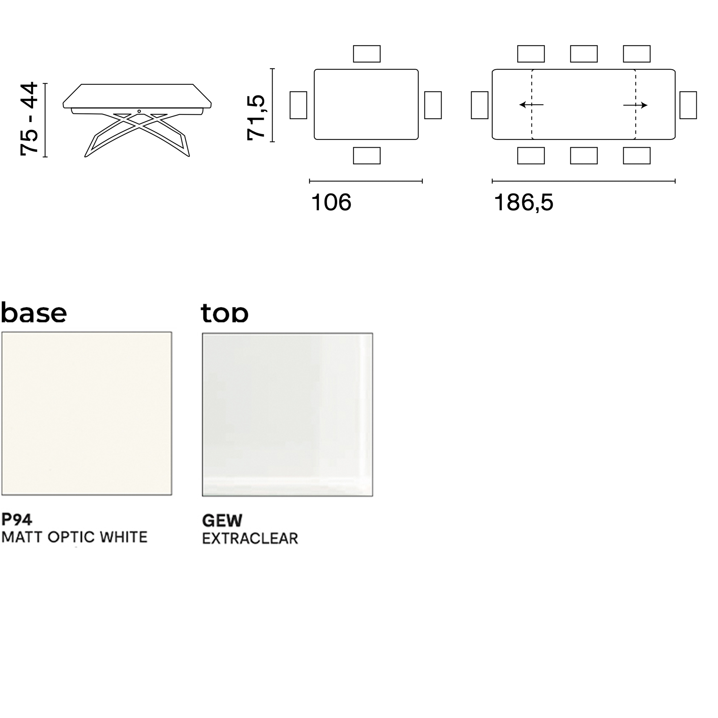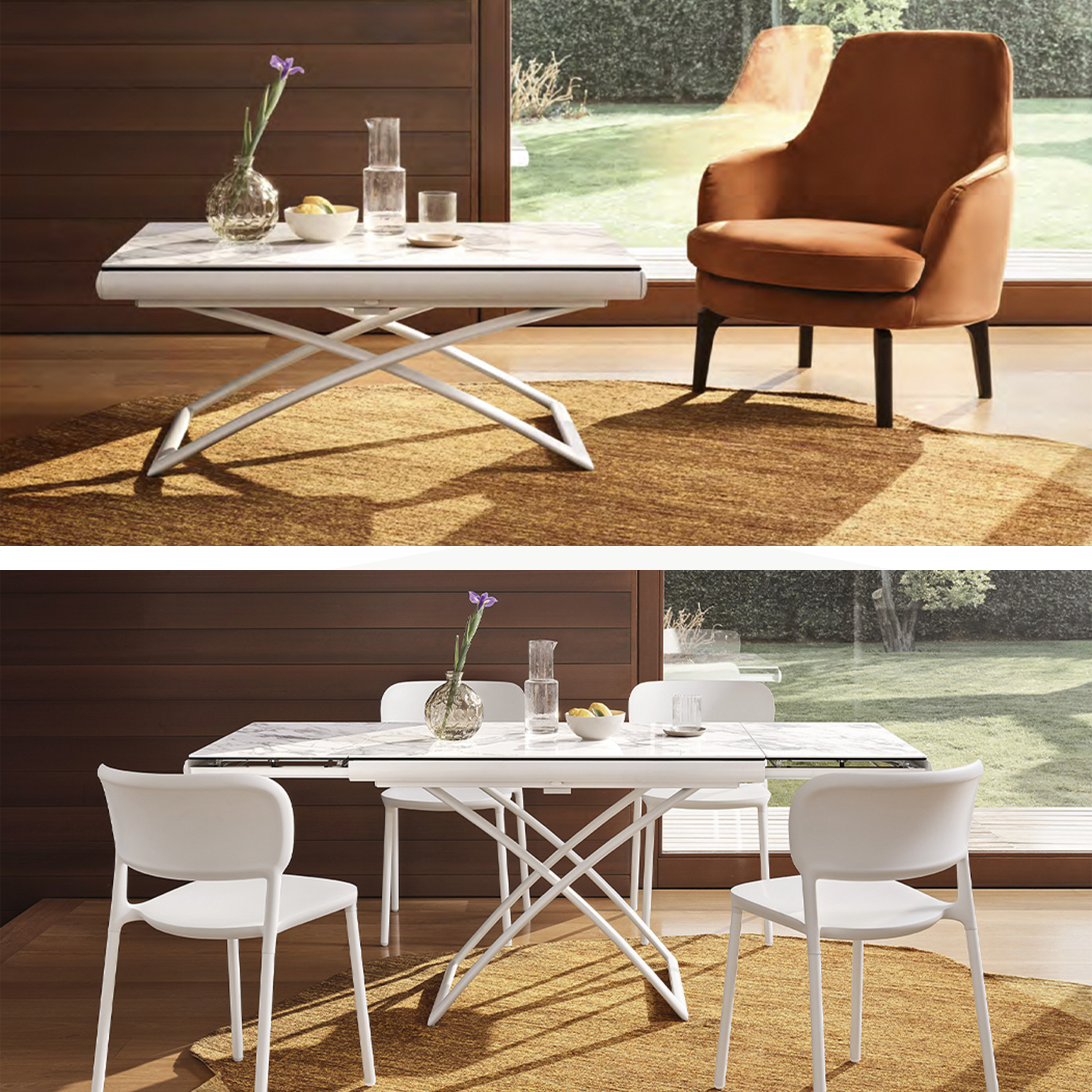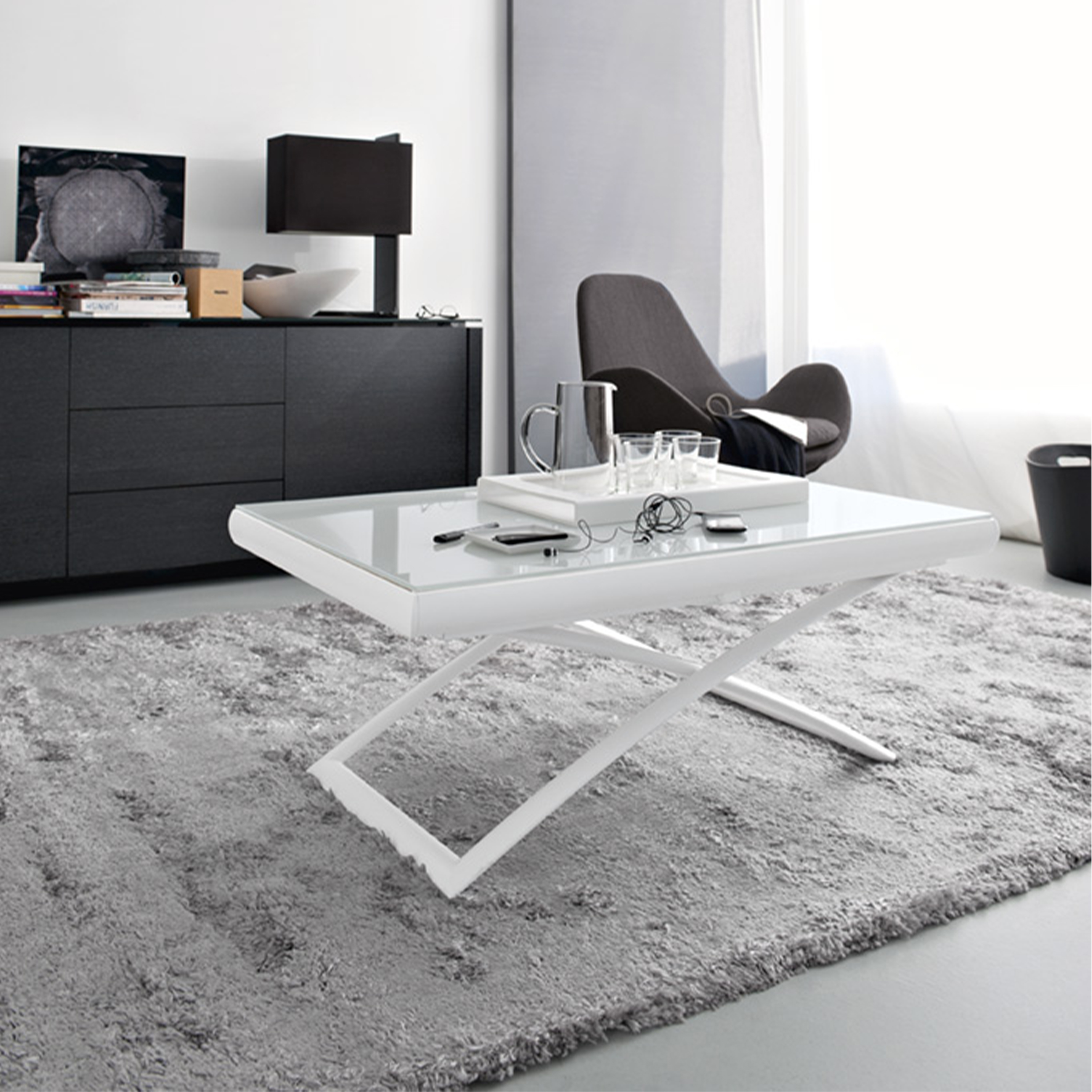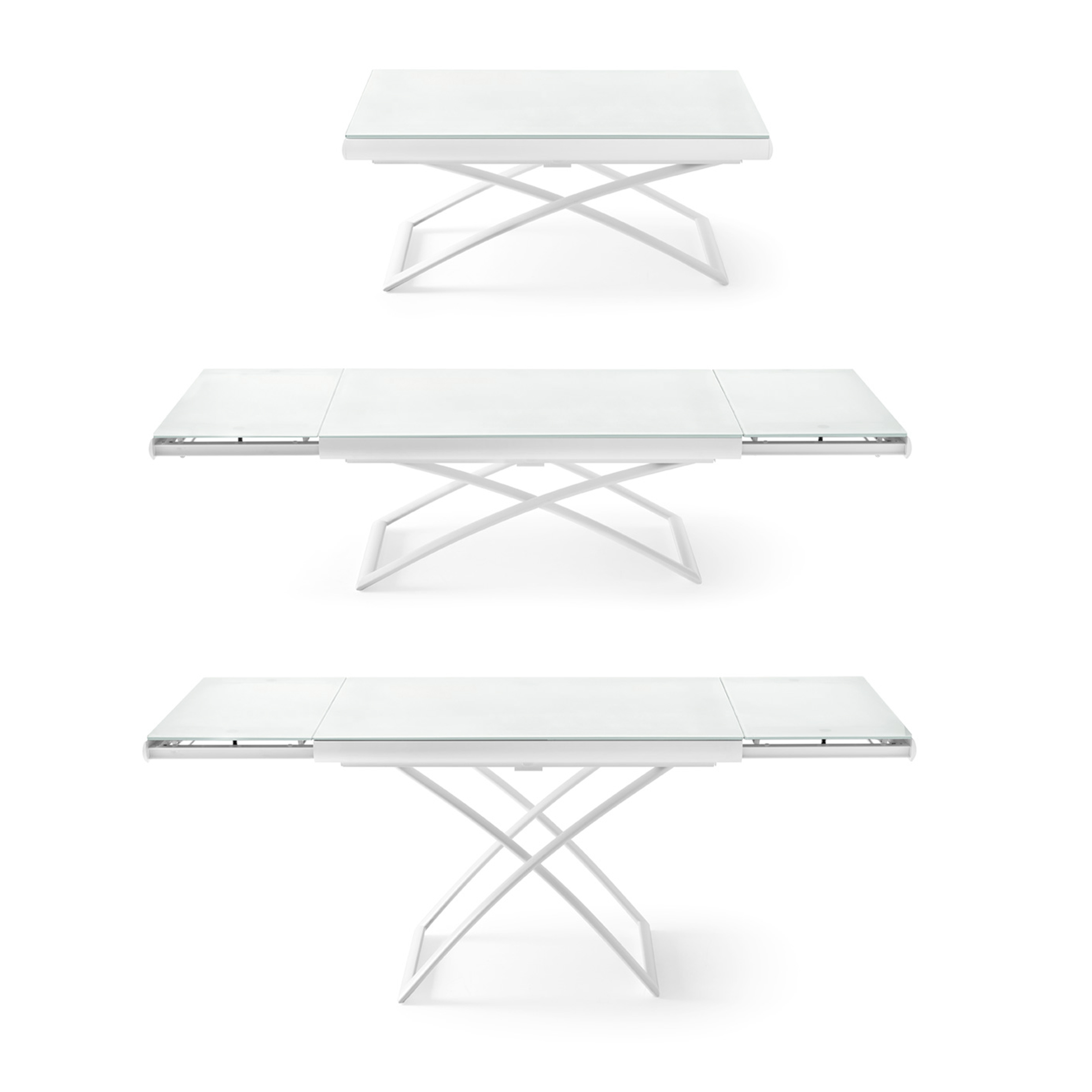 The DAKOTA table by Calligaris is a stunning piece. It combines a metal frame with a top glass . This extendable and height-adjustable table is perfect for modern living spaces. It offers both versatility and style. The DAKOTA table can effortlessly transform from a stylish coffee table into a spacious dining table. It comfortably seats 6 to 8 guests. With a simple press of a button located on the long side, you can easily adjust the height. You can choose from 7 different positions to suit your needs.
