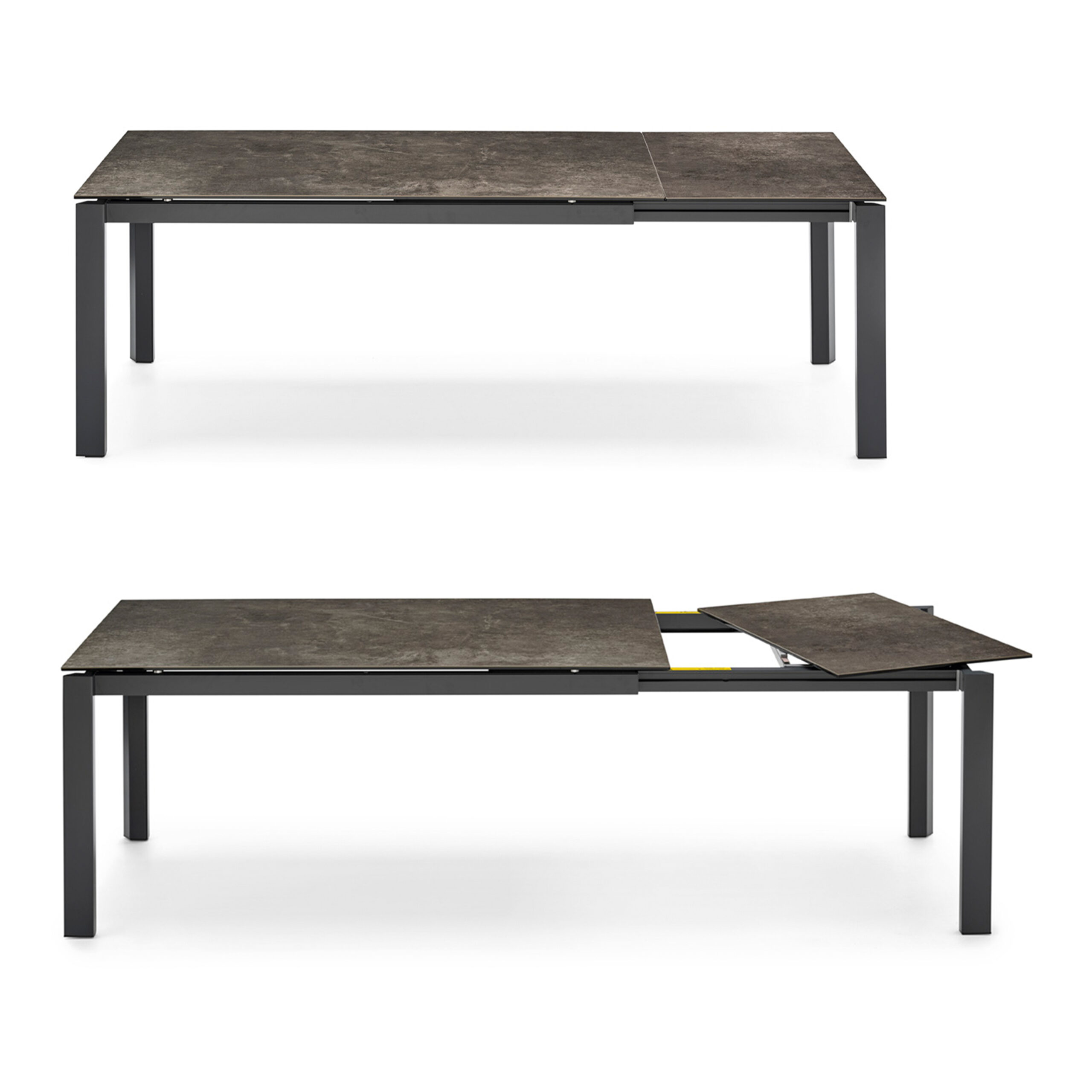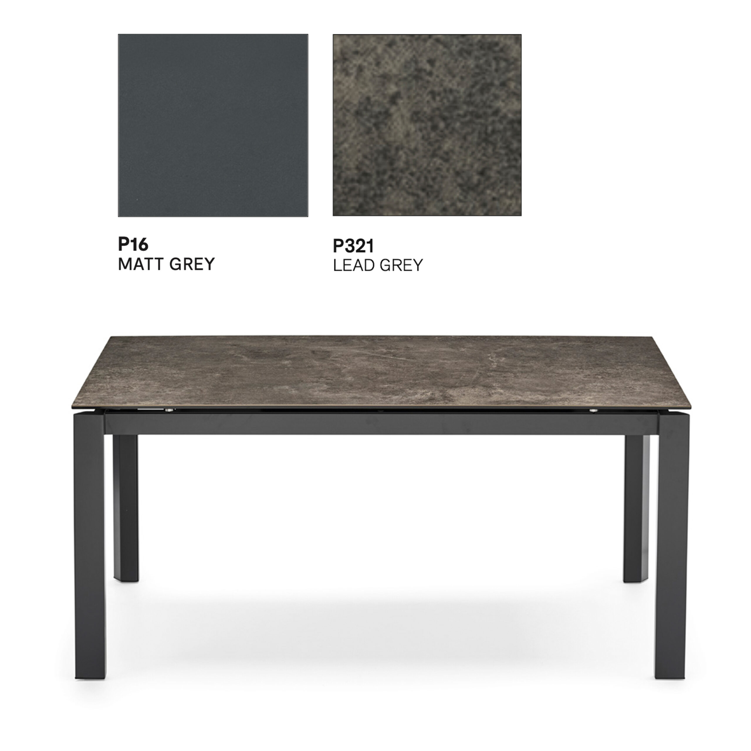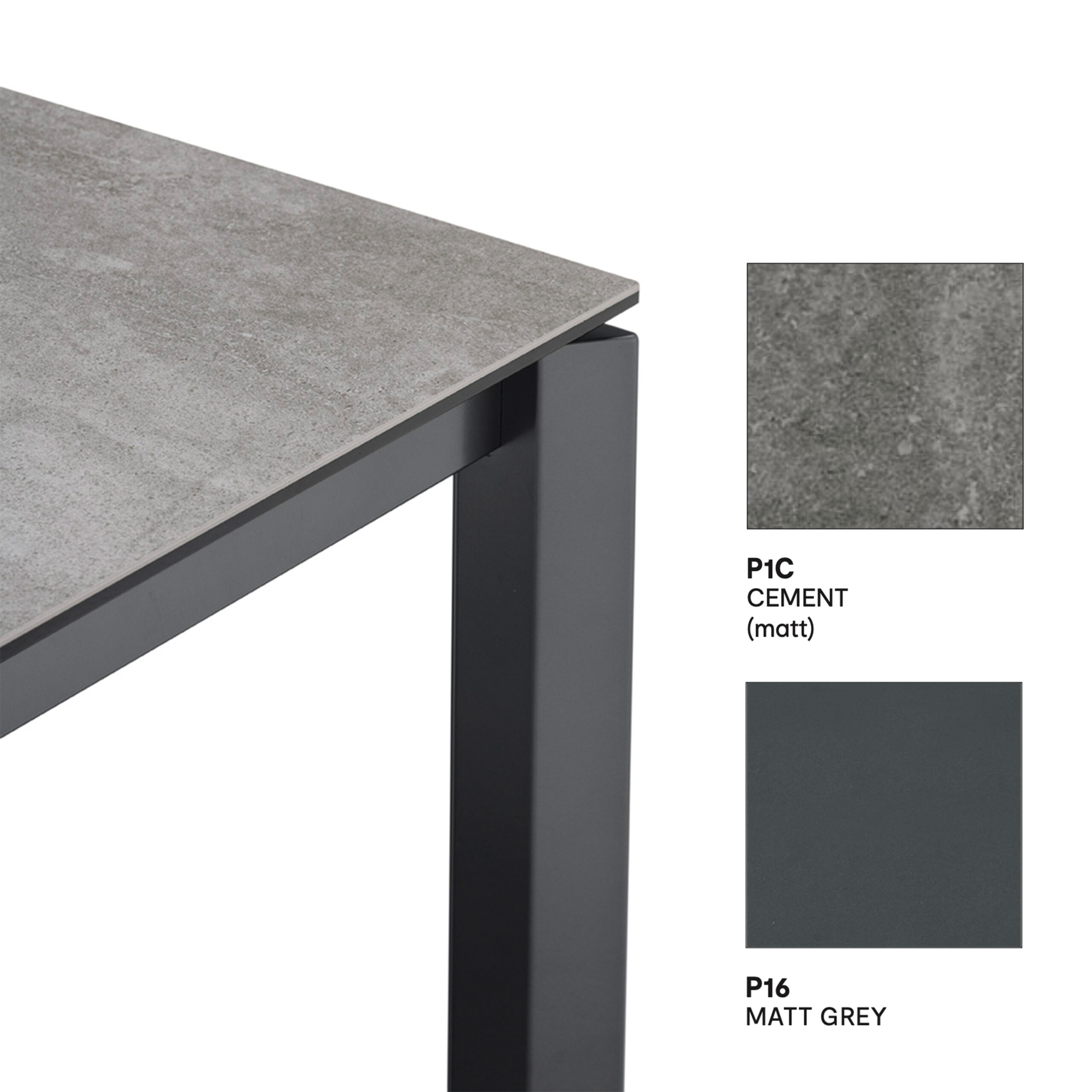 The tabletop is crafted in premium ceramic, offering outstanding resistance to scratches, stains, and heat. You can choose from six elegant ceramic finishes: Cement (P1C), Salt White (P5C), Lead Grey (P321), Oxide Black (P6C), and Nougat (P166).