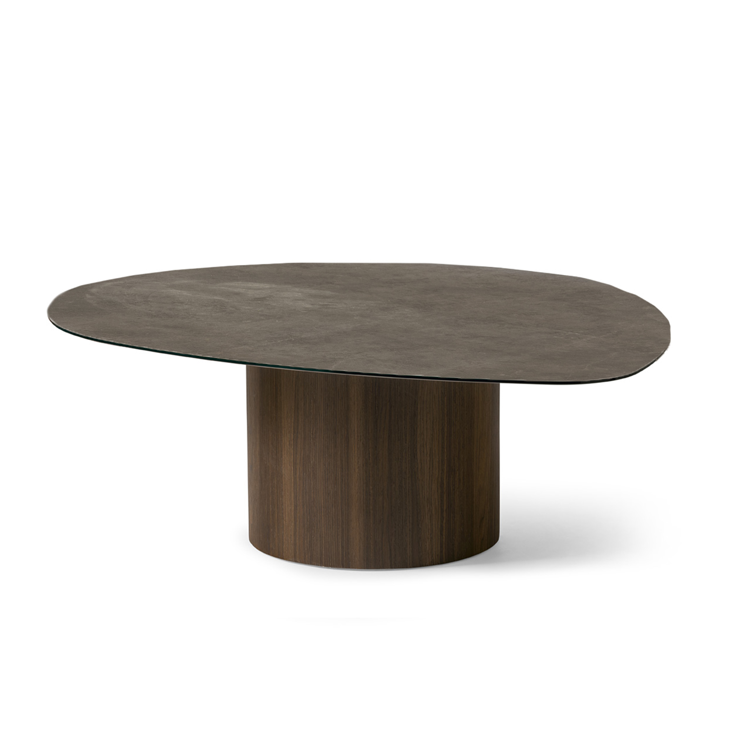 The sleek cylindrical wooden base is slightly askew, giving the impression that the top is suspended slightly above it.