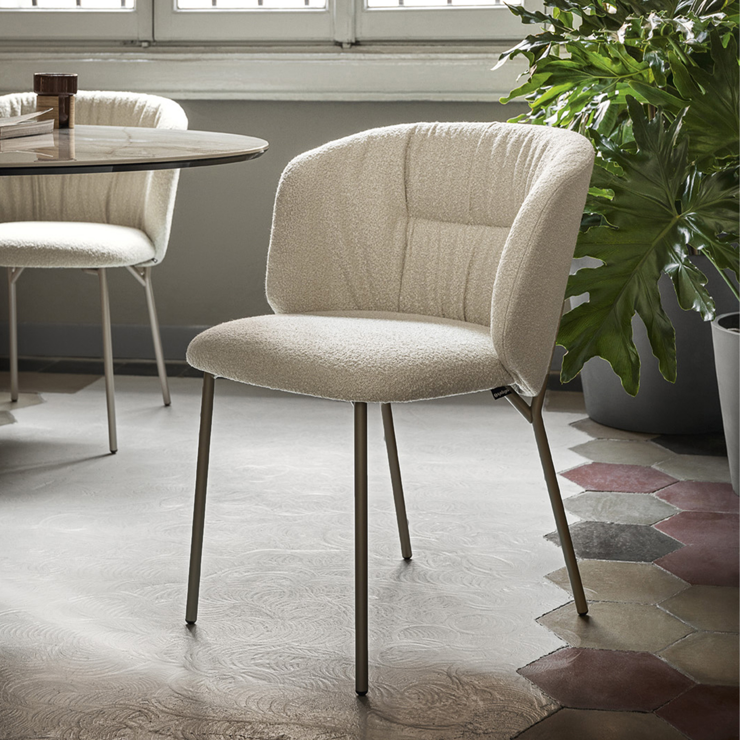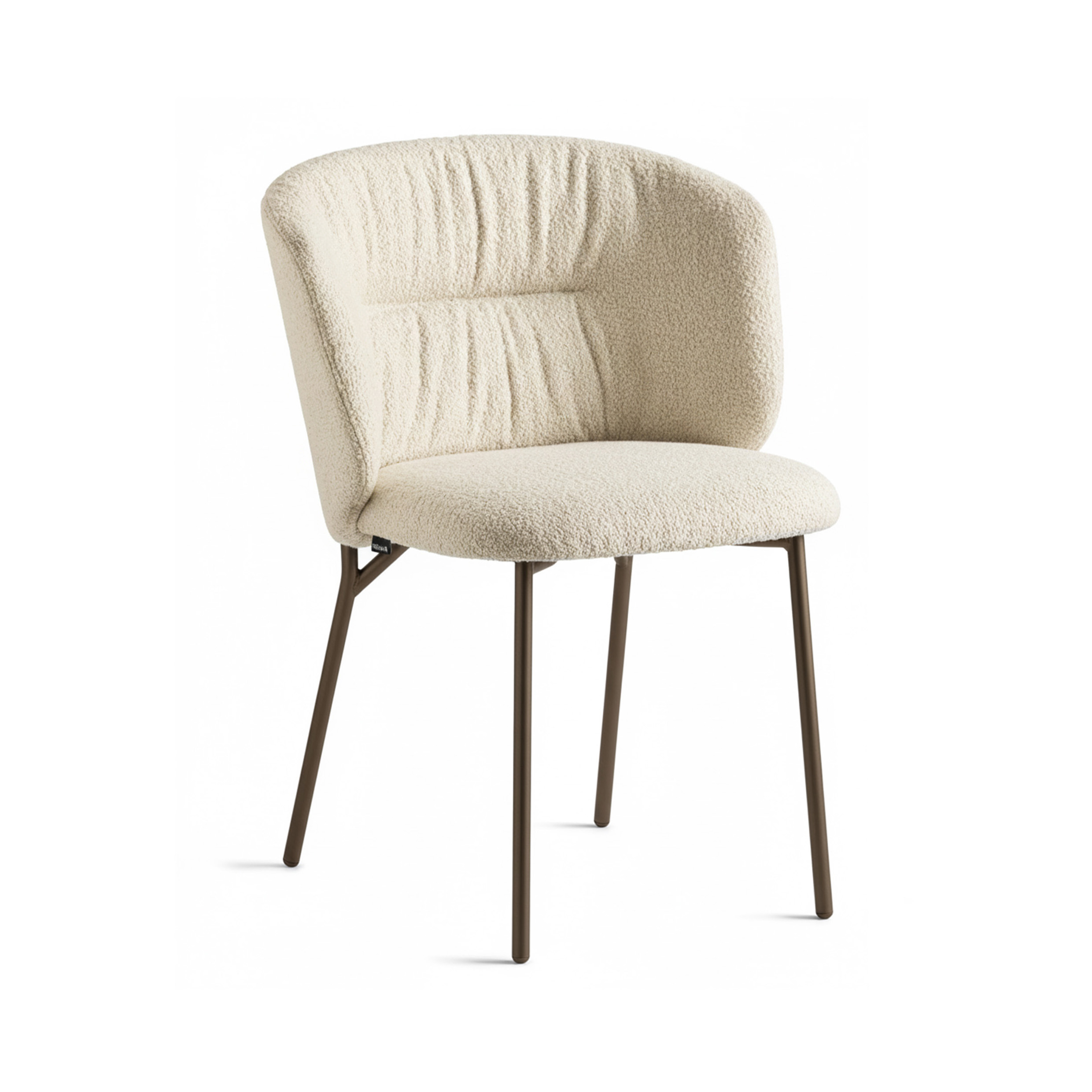 The minimalist metal base in Bronze (P29L) adds a warm, contemporary touch, while the seat upholstered in SQM cream fabric creates a welcoming and comfortable feel. The gently enveloping backrest and padded seat ensure a pleasant sitting experience, even during long dinners.