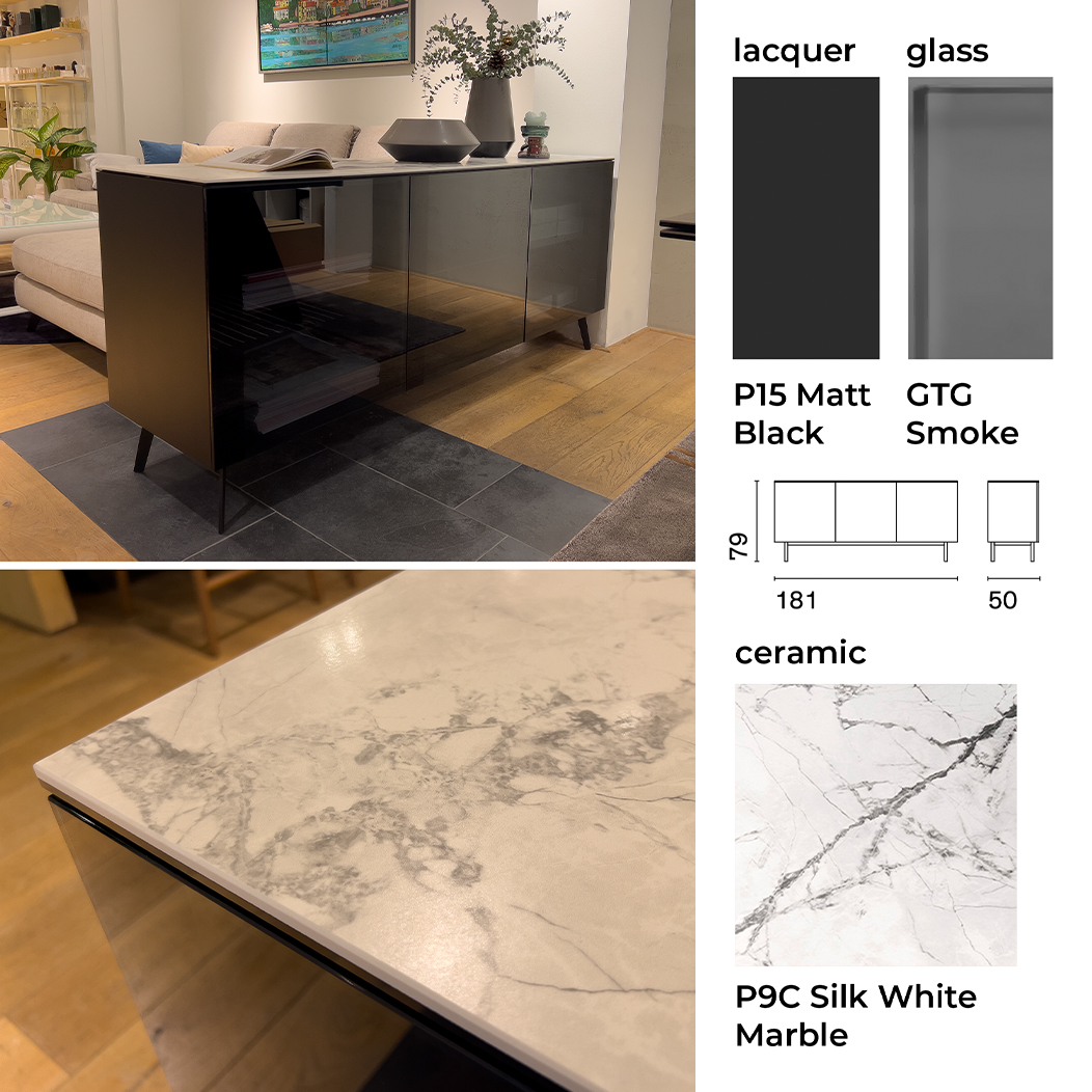 The Universal sideboard by Calligaris combines architectural precision with refined material contrasts. Designed for contemporary interiors, this Italian designer sideboard balances matte lacquer, ceramic marble-effect top, and smoked glass doors in a clean, structured silhouette.